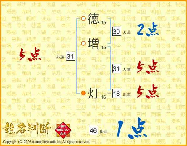 生活面を象徴する運勢です。外部から受ける影響力を表し、結婚運、家庭運や職場、環境への順応性を表します。総運から人運を引いた画数。姓や名が1文字の場合を除く。