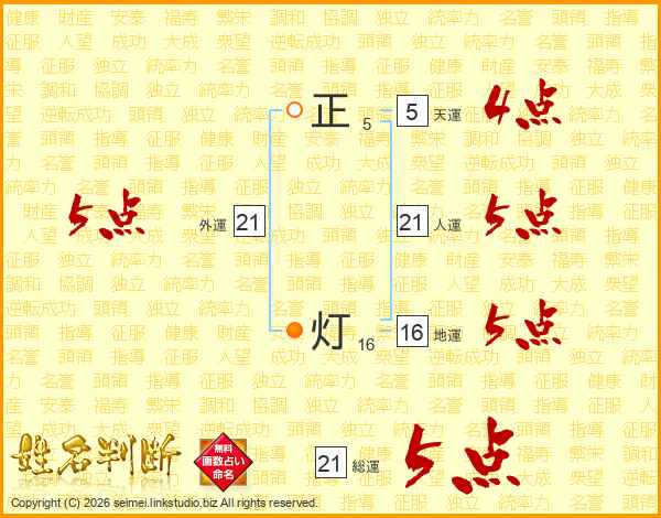 あなたの人生を表す1番重要な運勢です。生涯を通じて影響する総合運となり、主に50歳以降の晩年期に影響を及ぼします。苗字と名前の合計画数。