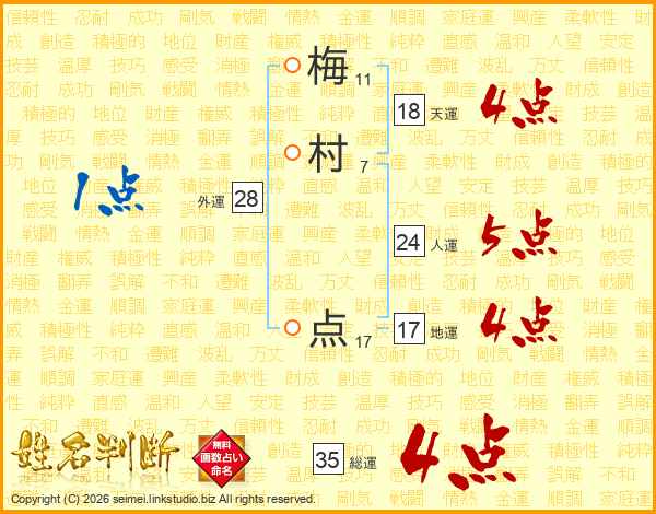 梅(11画)村(7画) 点(17画)