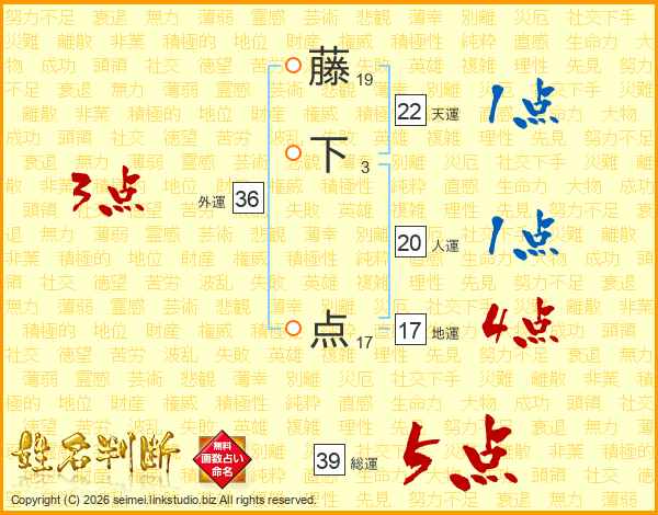 生活面を象徴する運勢です。外部から受ける影響力を表し、結婚運、家庭運や職場、環境への順応性を表します。総運から人運を引いた画数。姓や名が1文字の場合を除く。