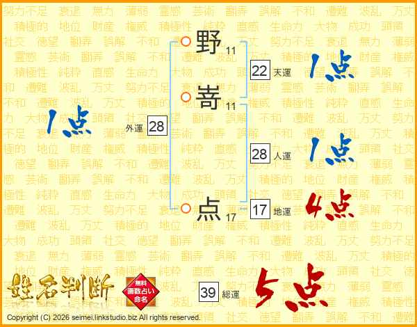野嵜点さんの総運は39画の5点!