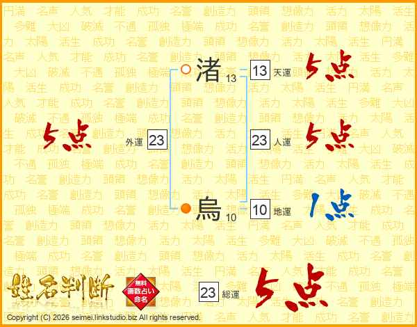 生活面を象徴する運勢です。外部から受ける影響力を表し、結婚運、家庭運や職場、環境への順応性を表します。総運から人運を引いた画数。姓や名が1文字の場合を除く。