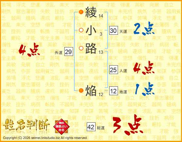 生活面を象徴する運勢です。外部から受ける影響力を表し、結婚運、家庭運や職場、環境への順応性を表します。総運から人運を引いた画数。姓や名が1文字の場合を除く。