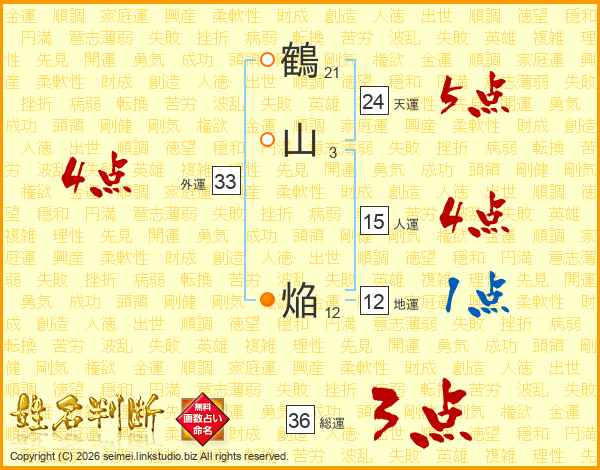 鶴山焔さんの外運は33画の4点!