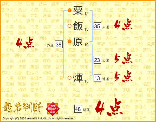 粟飯原煇さんの総運は48画の4点!