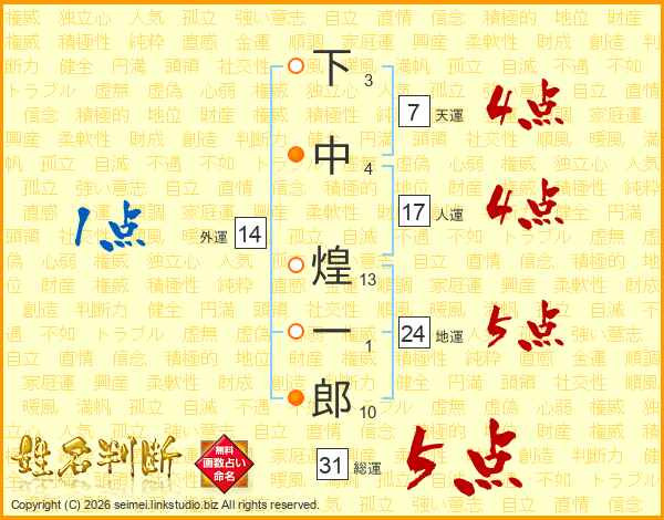 下(3画)中(4画) 煌(13画)一(1画)郎(10画)