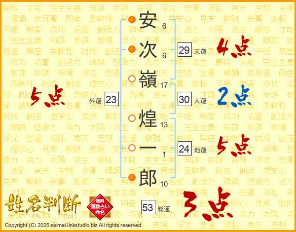 安(6画)次(6画)嶺(17画) 煌(13画)一(1画)郎(10画)