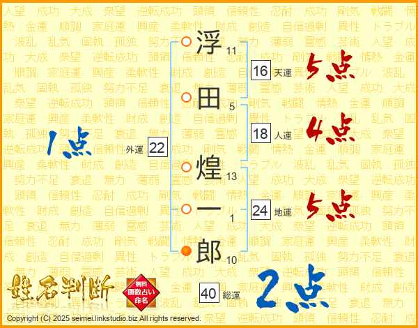 浮(11画)田(5画) 煌(13画)一(1画)郎(10画)