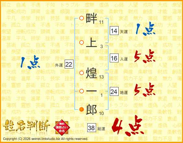 畔(11画)上(3画) 煌(13画)一(1画)郎(10画)