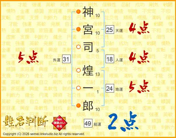 神(10画)宮(10画)司(5画) 煌(13画)一(1画)郎(10画)