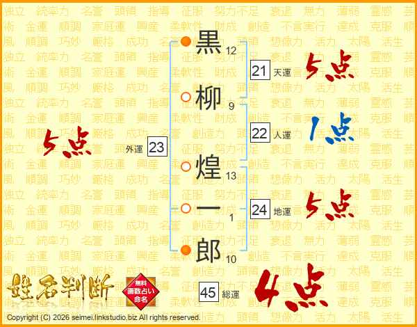黒(12画)柳(9画) 煌(13画)一(1画)郎(10画)