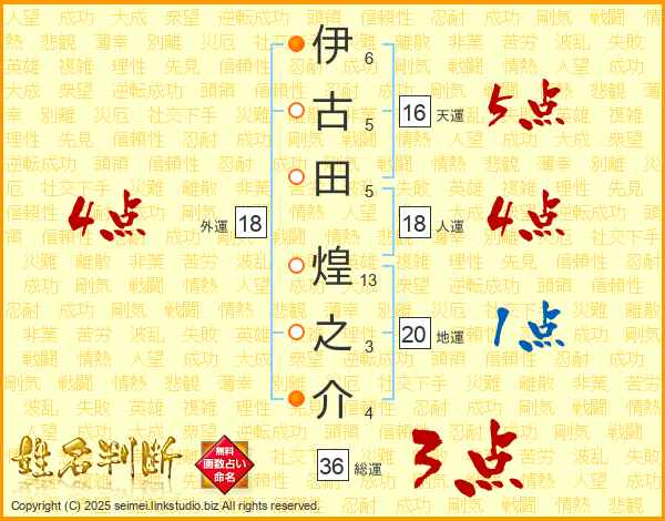 伊(6画)古(5画)田(5画) 煌(13画)之(3画)介(4画)
