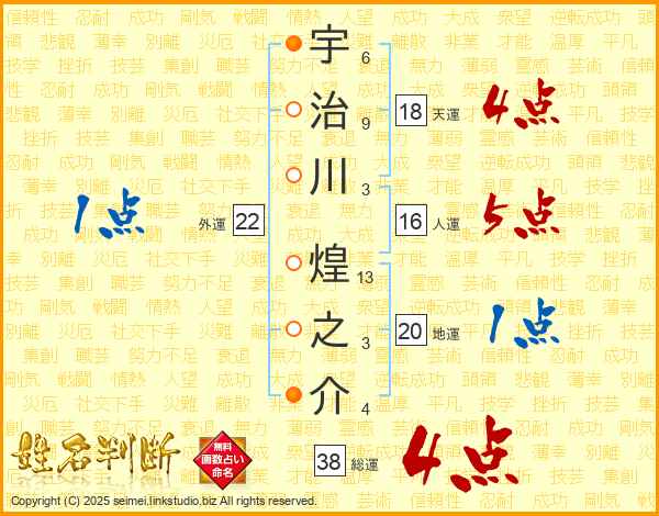 宇治川煌之介さんの総運は38画の4点!