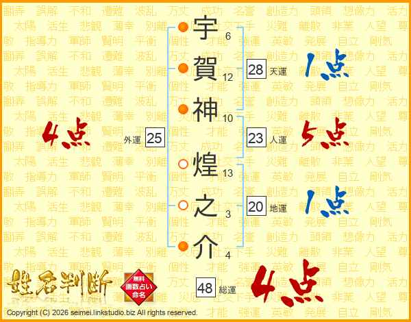 宇(6画)賀(12画)神(10画) 煌(13画)之(3画)介(4画)
