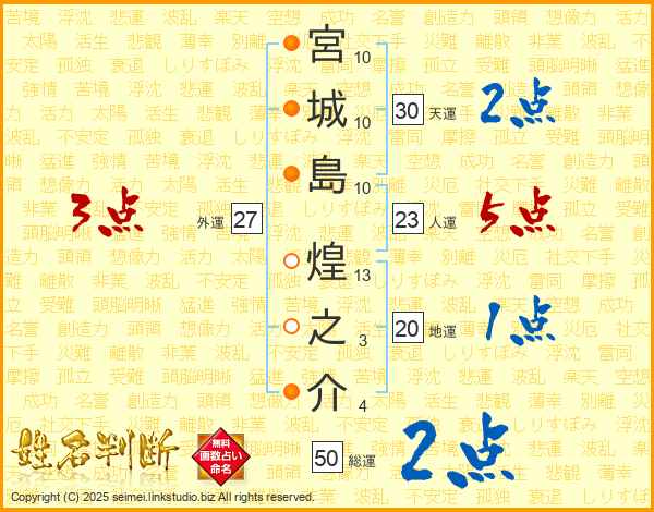 宮(10画)城(10画)島(10画) 煌(13画)之(3画)介(4画)