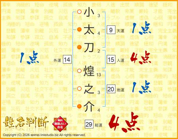 小(3画)太(4画)刀(2画) 煌(13画)之(3画)介(4画)