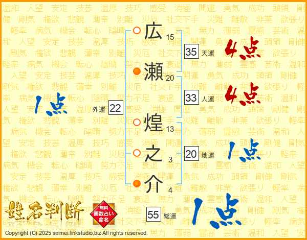 広(15画)瀬(20画) 煌(13画)之(3画)介(4画)