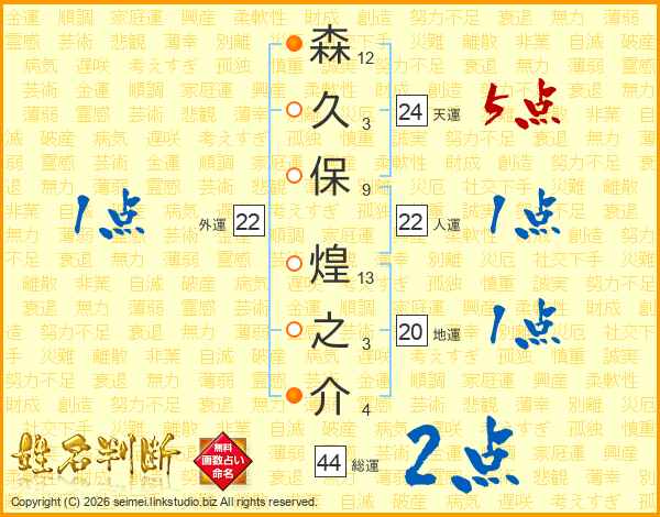 森(12画)久(3画)保(9画) 煌(13画)之(3画)介(4画)