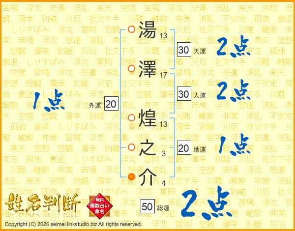 湯(13画)澤(17画) 煌(13画)之(3画)介(4画)