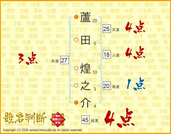 蘆(20画)田(5画) 煌(13画)之(3画)介(4画)