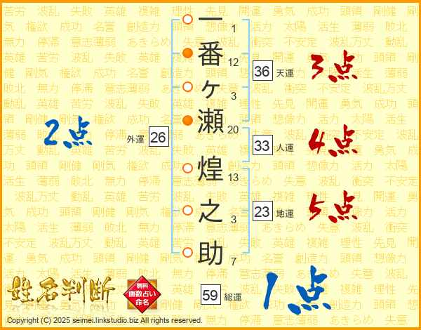 一番ヶ瀬煌之助さんの総運は59画の1点!