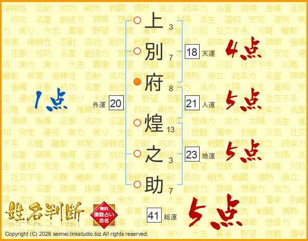 上別府煌之助さんの総運は41画の5点!