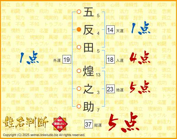 五(5画)反(4画)田(5画) 煌(13画)之(3画)助(7画)