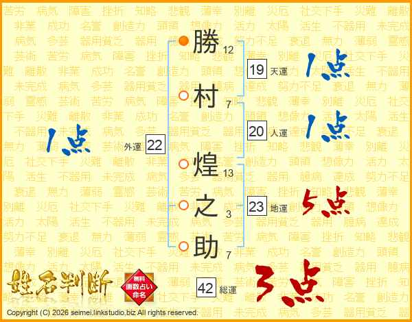 勝村煌之助さんの人運は20画の1点!