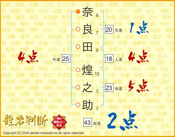 奈(8画)良(7画)田(5画) 煌(13画)之(3画)助(7画)