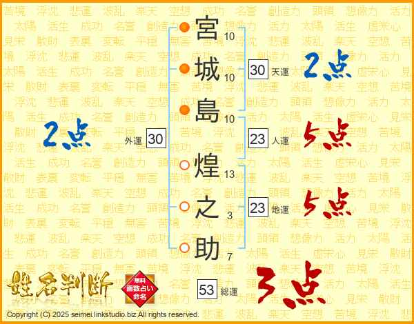 宮(10画)城(10画)島(10画) 煌(13画)之(3画)助(7画)