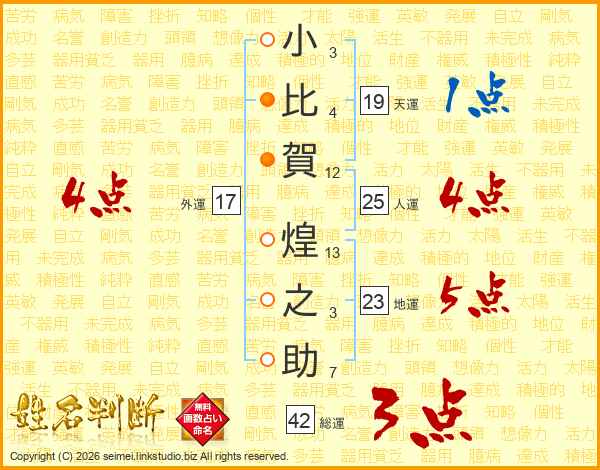 小(3画)比(4画)賀(12画) 煌(13画)之(3画)助(7画)
