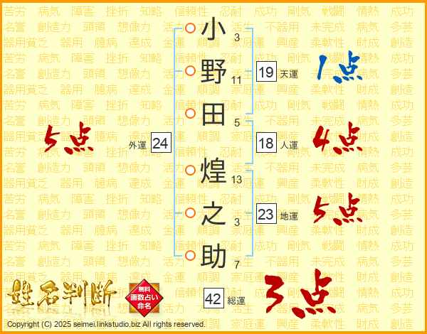 小(3画)野(11画)田(5画) 煌(13画)之(3画)助(7画)