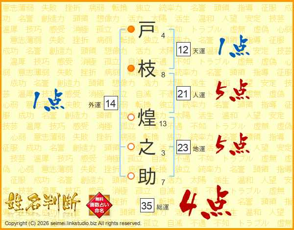 戸(4画)枝(8画) 煌(13画)之(3画)助(7画)