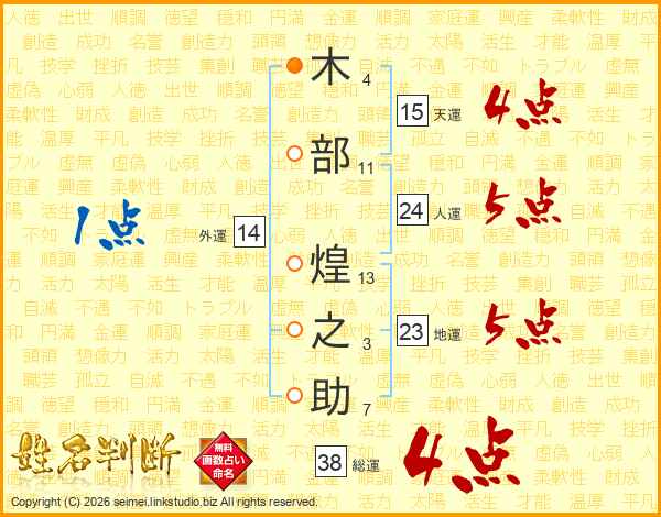木(4画)部(11画) 煌(13画)之(3画)助(7画)