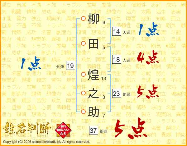 柳(9画)田(5画) 煌(13画)之(3画)助(7画)