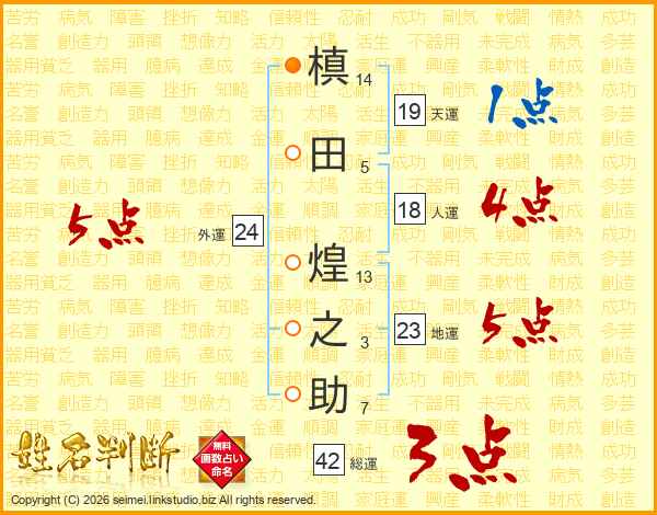 槙(14画)田(5画) 煌(13画)之(3画)助(7画)