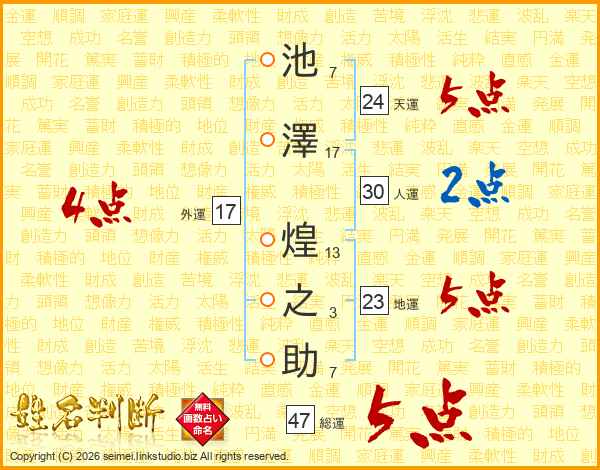 池(7画)澤(17画) 煌(13画)之(3画)助(7画)