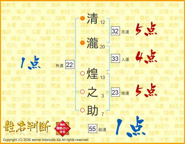 清(12画)瀧(20画) 煌(13画)之(3画)助(7画)
