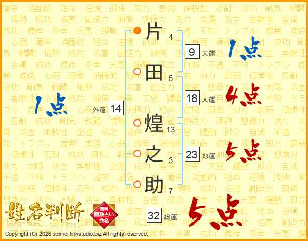 片(4画)田(5画) 煌(13画)之(3画)助(7画)