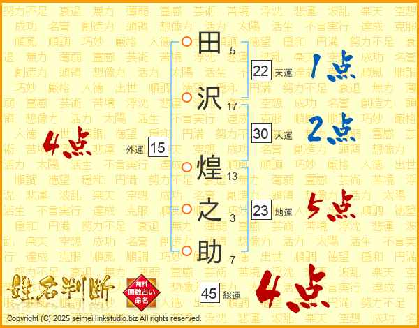 田沢煌之助さんの総運は45画の4点!