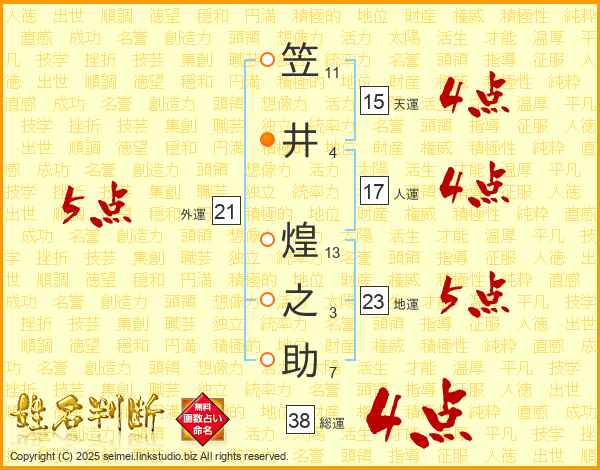 笠(11画)井(4画) 煌(13画)之(3画)助(7画)