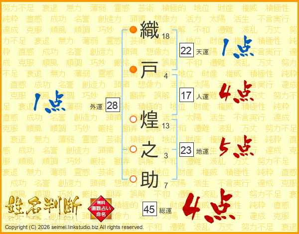 織(18画)戸(4画) 煌(13画)之(3画)助(7画)