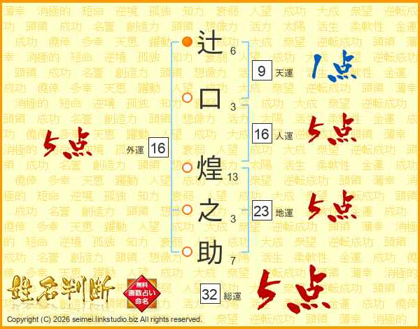 辻(6画)口(3画) 煌(13画)之(3画)助(7画)