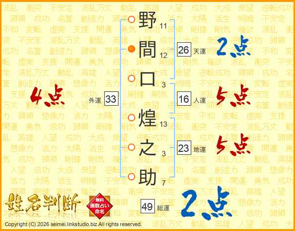 野(11画)間(12画)口(3画) 煌(13画)之(3画)助(7画)