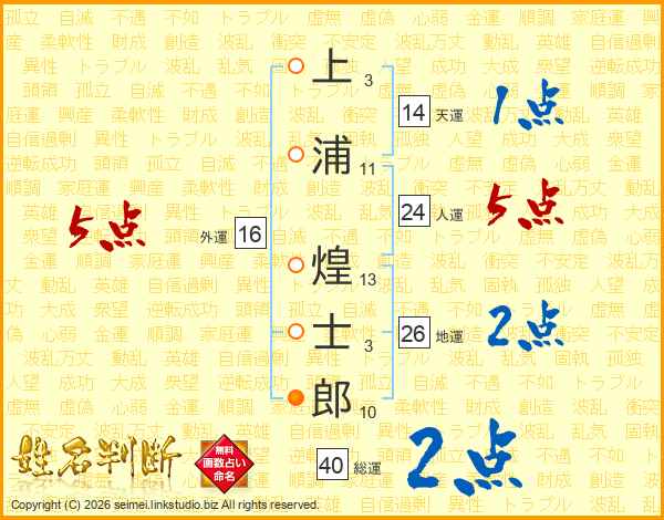 上(3画)浦(11画) 煌(13画)士(3画)郎(10画)