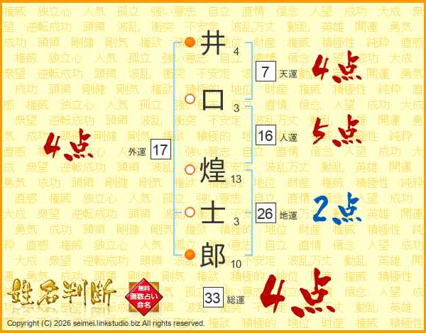 井(4画)口(3画) 煌(13画)士(3画)郎(10画)