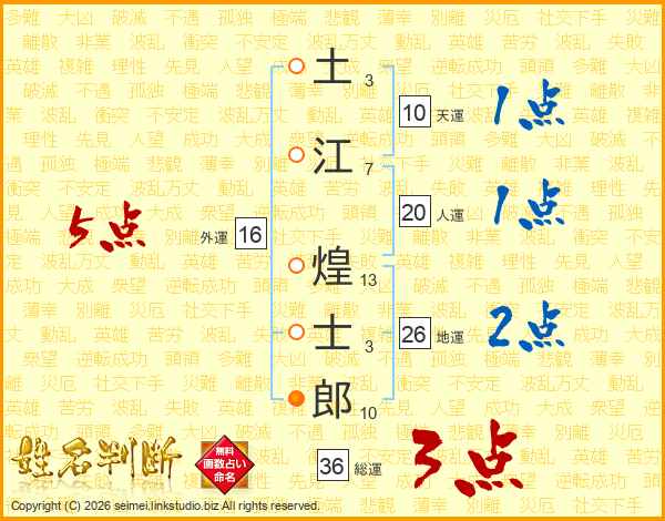 土(3画)江(7画) 煌(13画)士(3画)郎(10画)