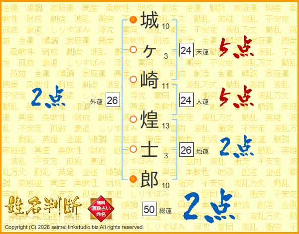 城(10画)ヶ(3画)崎(11画) 煌(13画)士(3画)郎(10画)