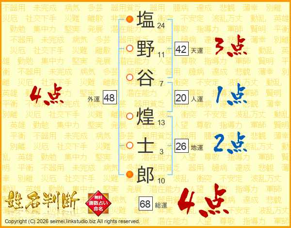 塩(24画)野(11画)谷(7画) 煌(13画)士(3画)郎(10画)