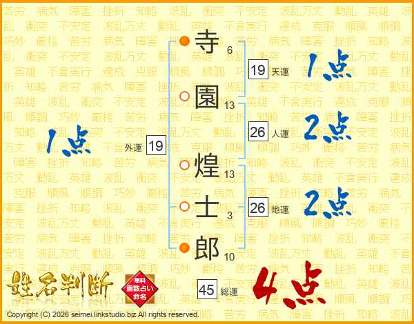 寺(6画)園(13画) 煌(13画)士(3画)郎(10画)